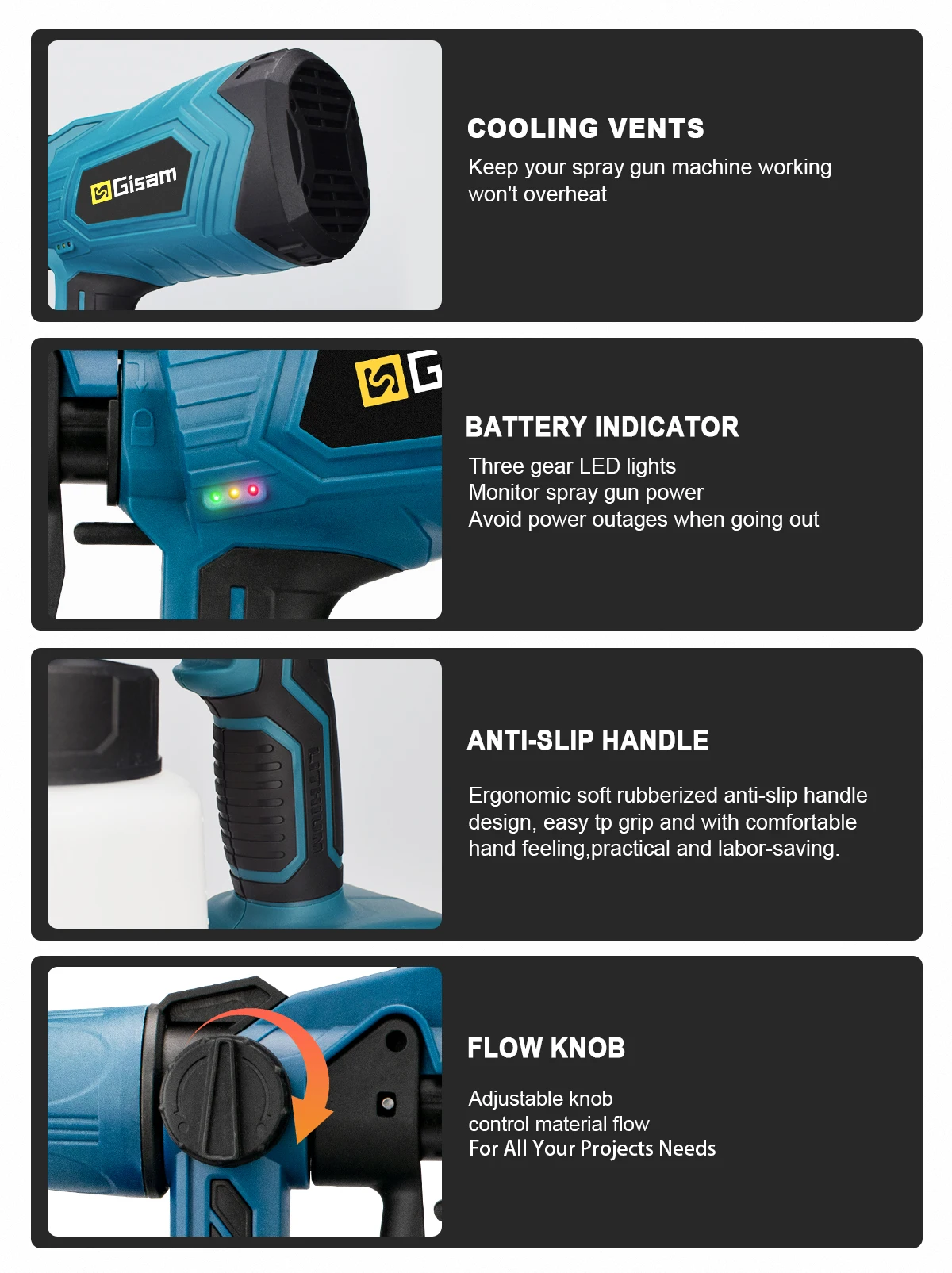 Controle de fluxo ajustável - Regule a saída de tinta ajustando o botão de controle de fluxo no pulverizador para obter diferentes saídas de tinta, adequado para bordas, cantos e amplas superfícies internas de vários projetos de trabalho e DIY